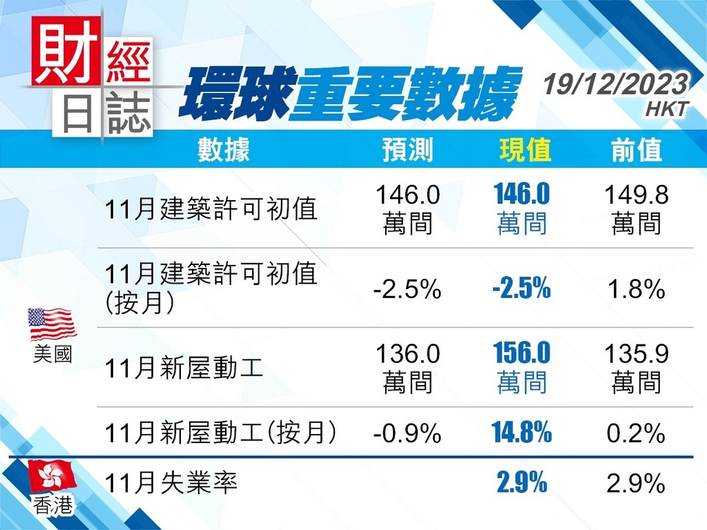 美國11月新屋動工按月升14.8%至156萬間,遠高於預期136萬間;期內營建許可按月跌2.5%至146萬間,略低於預期146.5萬間,續反映美國經濟未有顯著放緩,軟著陸機率進一步提升。美債息繼續回落,暫報3.914厘,逐步迫近3.9厘關口;美滙指數偏軟,暫報102.1。