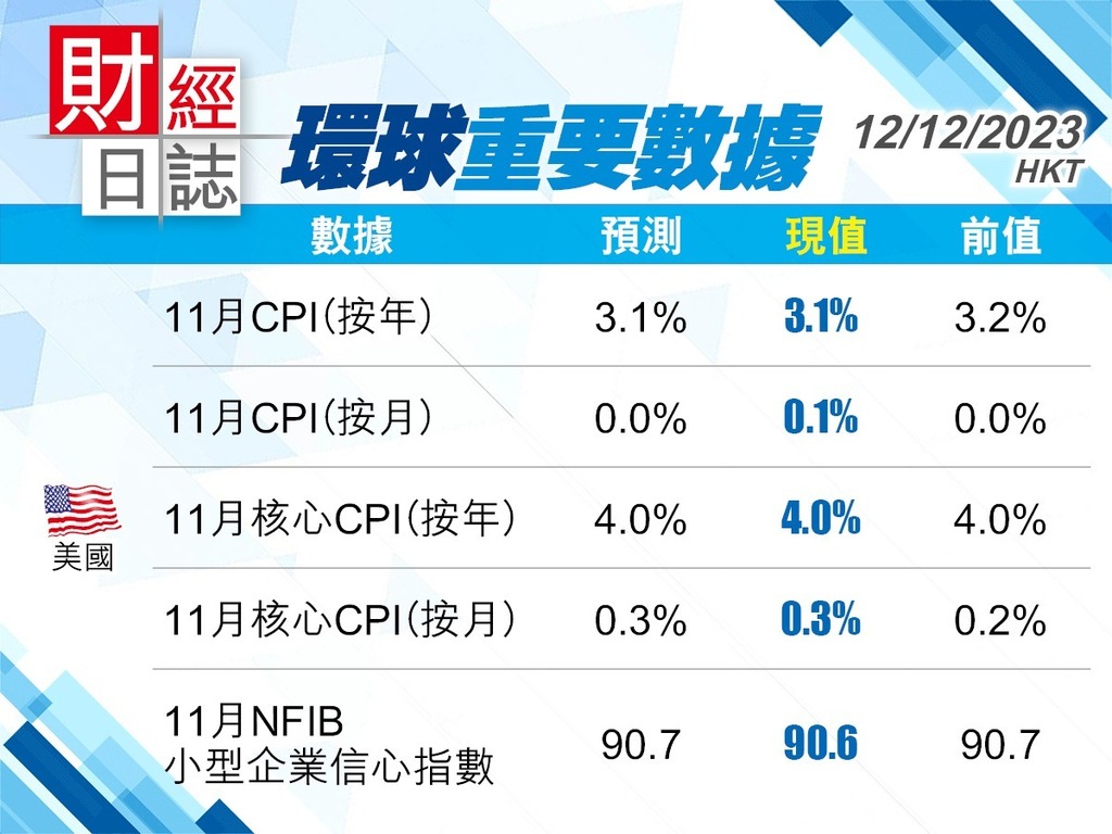 美國11月CPI按年升3.1%,符預期,前值為3.2%,按月微升0.1%,市場原預期持平。核心CPI按年則升4%,仍較儲局目標高一倍,符預期,按月升0.3%,同樣符預期。