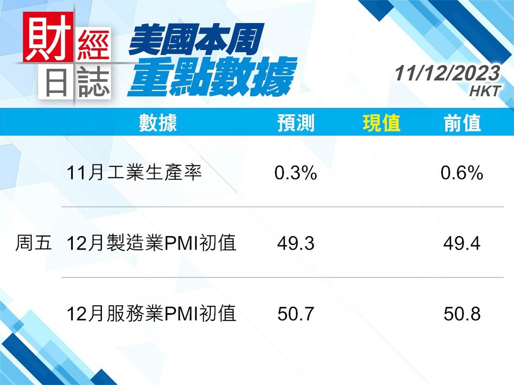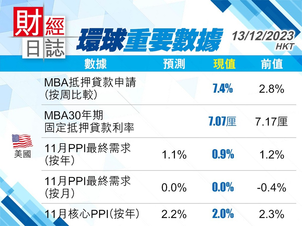 另外,美國最新經濟數據反映經濟及通脹有放緩跡象,11月PPI(Producer Price Index,生產物價指數)按年升0.9%,較10月升1.3%下跌0.4個百分點,低於市場預期1%;按月則由10月跌0.4%轉為持平,符預期。核心PPI方面,按年升幅回落0.4個百分點至2%,低於市場預期2.2%;按月持平,同樣低於預期升0.2%。